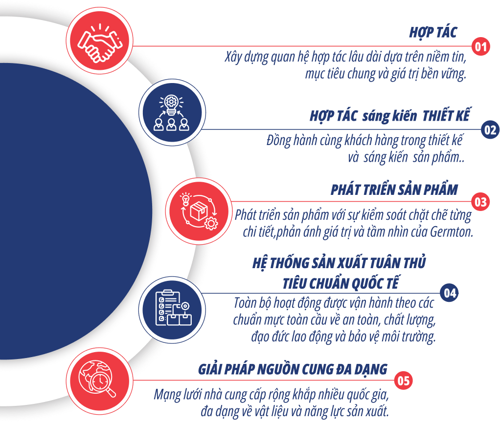 Chúng tôi cam kết tuân thủ các tiêu chuẩn quốc tế cao nhất trong hoạt động sản xuất. Hệ thống giấy chứng nhận đa dạng từ chứng nhận an toàn, quản lý chất lượng đến trách nhiệm xã hội; thể hiện rõ cam kết lâu dài của Germton với đối tác toàn cầu.